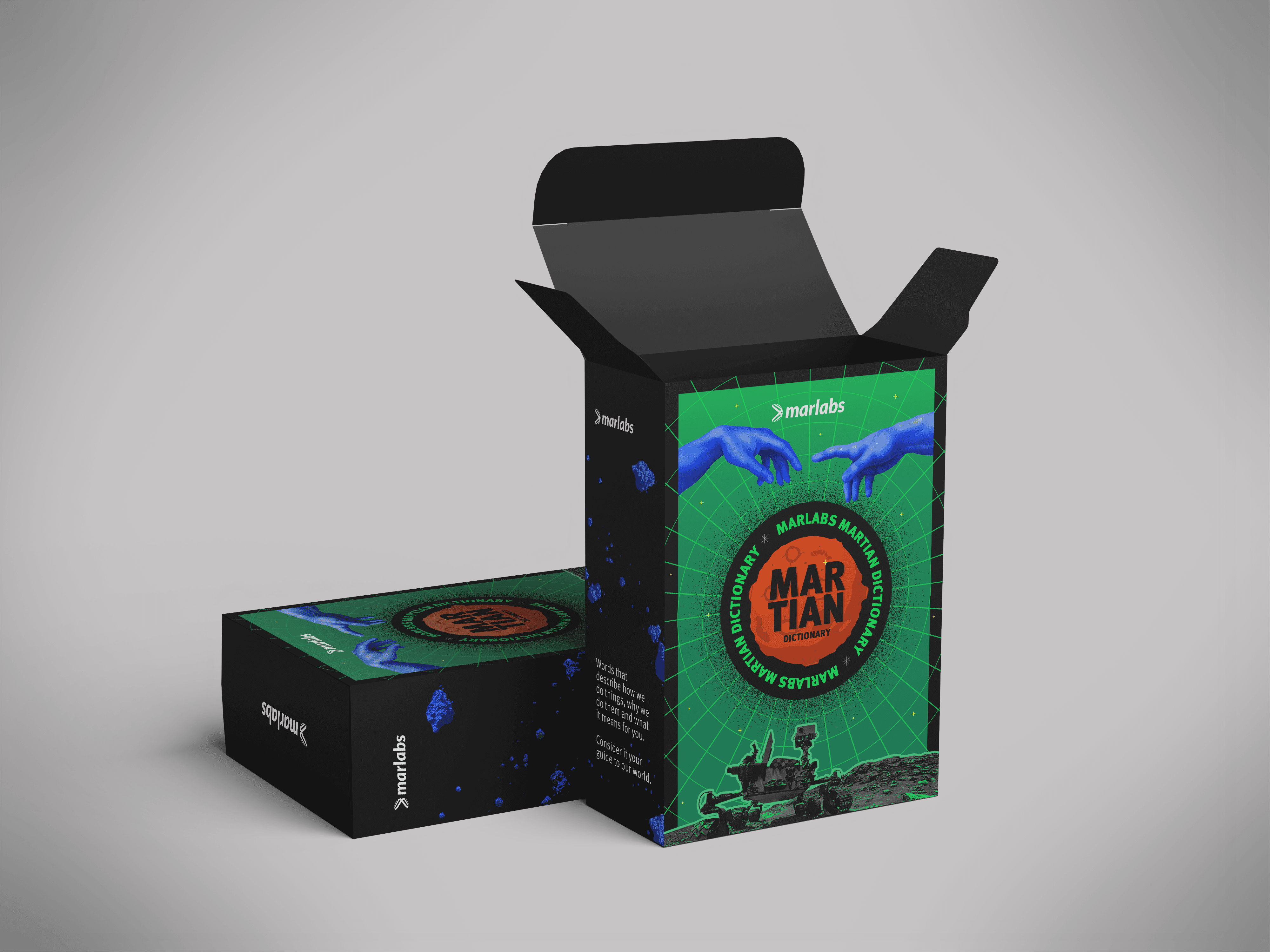 This project was created as a fun, interactive brand exercise for Marlabs’ employees and new joiners. I designed an internal experience and onboarding merchandise around a “Martian Dictionary” concept. A fictional language for “Mar-ians” was created using playful gibberish to express brand values. The result was an engaging, memorable way to experience the Marlabs brand beyond onboarding.